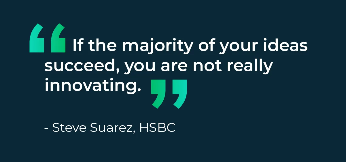Often, we think of large organizations as too encumbered and stuck to innovate. Still, in the work of HSBC, the sheer number of ideas generated helps employees discover new solutions. HSBC has an extensive database to manage all innovation ideas gathered from teams worldwide, allowing employees to explore similarities in their problems or see that an idea has already been tried but failed. Managing the volume of initiatives and experiments is key to avoiding confusion or duplicated effort.Â
