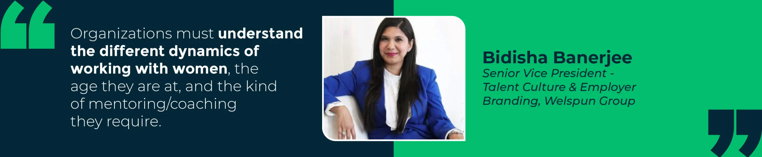 “Organizations must understand the different dynamics of working with women, the age that they are at, and the kind of mentoring or coaching they require,” says Bidisha Banerjee. When it comes to flexibility at work, leaders must work with women employees to design flexible solutions. For instance, integrate work-from-home options to reduce their commute time. Organizations can also create training programs that focus on developing soft skills to help with confidence issues, especially in industries predominantly dominated by men.