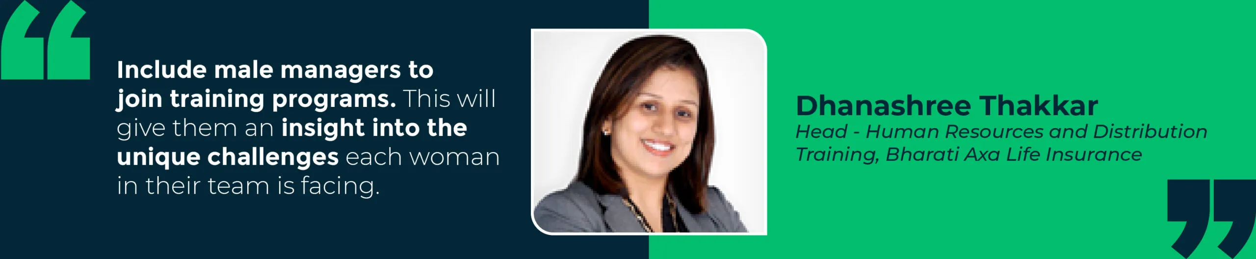 From long work hours to a lack of flexibility in working arrangements, from fewer opportunities to grow to not enough support from managers, women face many unique challenges in today’s workplaces. All our interviewees agreed that factors such as a lack of support from managers, tokenism in the form of policies like Diversity, Equity & Inclusion (DEI), and the negligible presence of male managers in women’s training and development programs also affect the chances of women taking on more prominent roles and advancing in their careers.