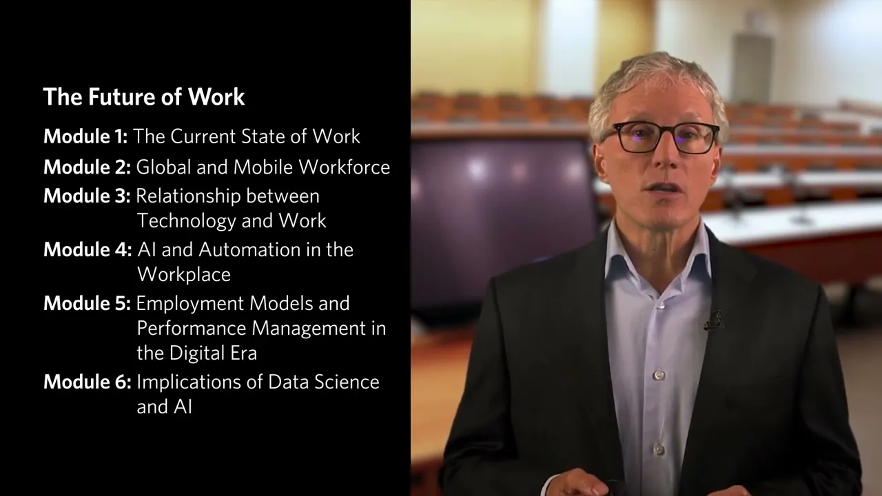 So, in Module 1: Current State of Work, six of the eight forces. In the second module, Zeke Hernandez will focus on the increasingly global and mobile workforce and what it means for companies attempting to harness this talent in organizing their future workplaces. And Zeke will pay a lot of attention to the flow of human capital across geographic and national boundaries, immigration, demographic trends, and the like. In the third module, I'll be back to talk about the relationship between technology and work and specifically between automation and employment levels and skills. Then, in the fourth module, Sonny Tambe picks up those technology themes and extends them via his Part 1 session on artificial intelligence and machine learning.Â