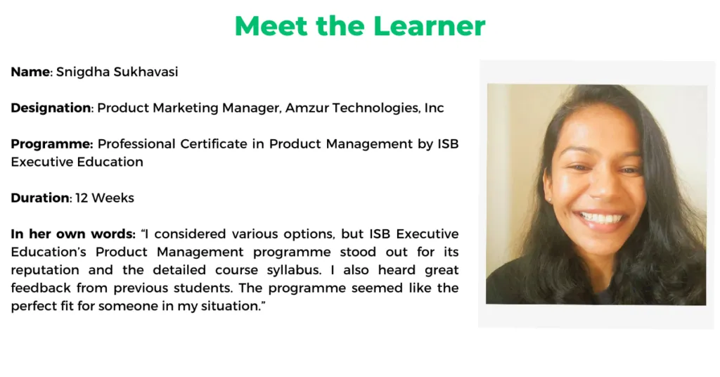As a product marketing manager at an IT company, Sukhavasi was already somewhat involved in product-related discussions, but she realised that she needed a more comprehensive understanding of product management to make a full transition. “I’d always been interested in product management,” she reflects, “but I knew I needed to upskill. You can’t just move into a new field without the right knowledge base.”